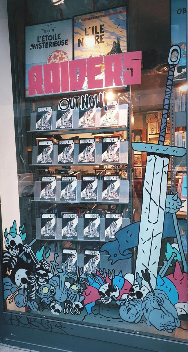 Raiders made its debut in the UK at Gosh Comics in London. Crom himself painted the window display. A first for me and a new level of cool.